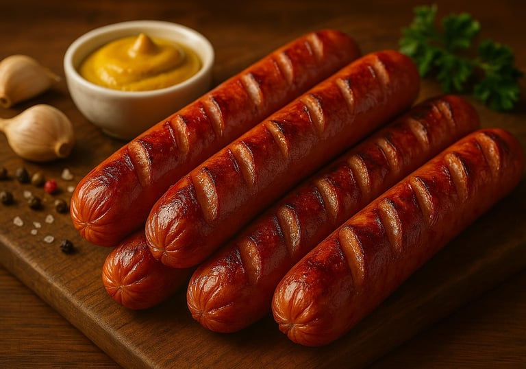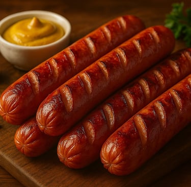 Deliciosas salchichas elaboradas con carne selecta de cerdo seleccionada y especias únicas, ideal para asados desayunos familiares.